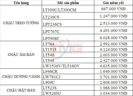 TMG gửi quý khách tham khảo giá những mẫu chậu rửa mặt bán chạy nhất qua bảng dưới đây: