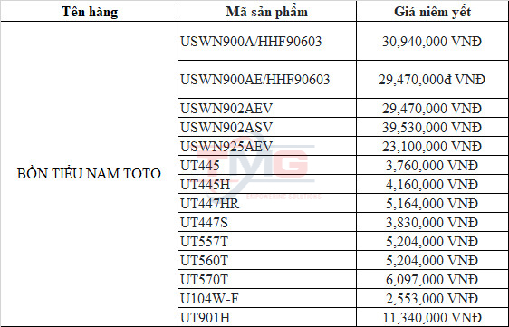 Dưới đây là bảng giá bồn tiểu nam TOTO mới nhất: