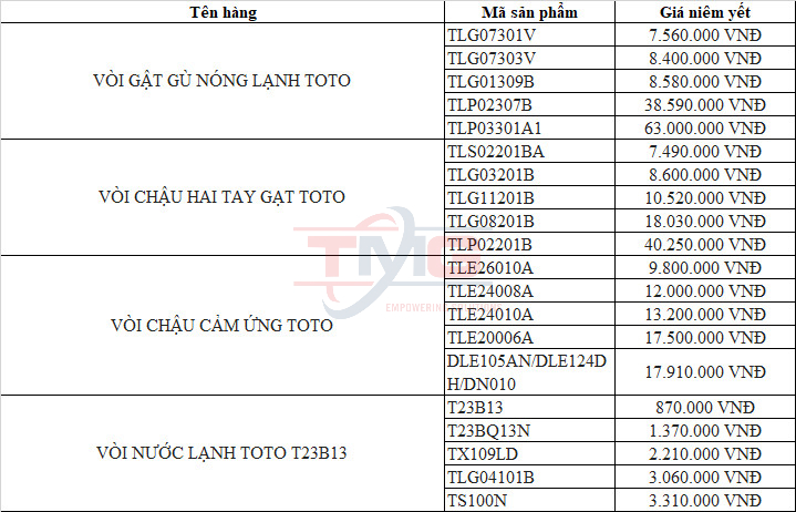 Vòi chậu TOTO chia thành 4 loại: vòi nước lạnh, vòi cảm ứng, vòi gạt, vòi gật gù. Mẫu vòi được khách hàng yêu thích nhất TMG tổng hợp qua bảng giá sau: