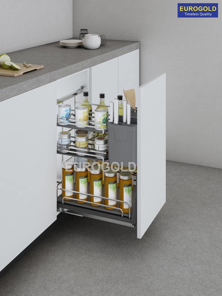 – Bộ ray có cấu tạo chắc chắn, chịu được trọng tải lớn lên tới 20kg giúp bạn thoải mái lưu trữ, bảo quản các chai lọ gia vị, dao thớt và đũa thìa tránh môi trường ẩm mốc và sinh vật gây hại.