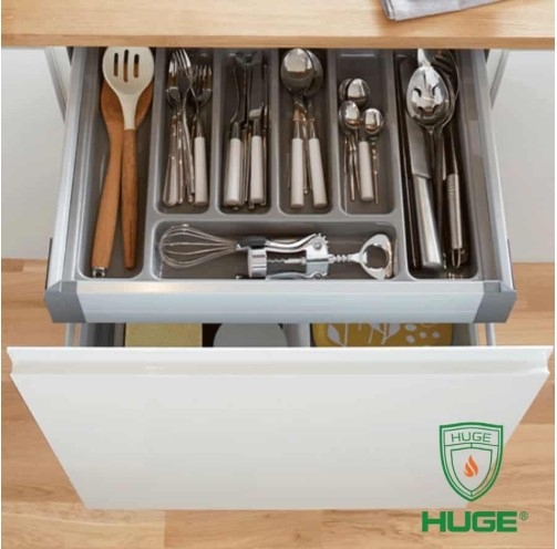 Khay chia thìa dĩa Huge có nhiều ô với kích thước khác nhau phù hợp với việc chứa thìa dĩa có kích thước khác nhau. Sản phẩm cũng có nhiều loại khay chia với số lượng ô chia khác nhau phù hợp với kích thước ngăn kéo của tủ bếp. Chất liệu nhựa cao cấp, sản xuất theo công nghệ Đức, tiêu chuẩn Châu Âu