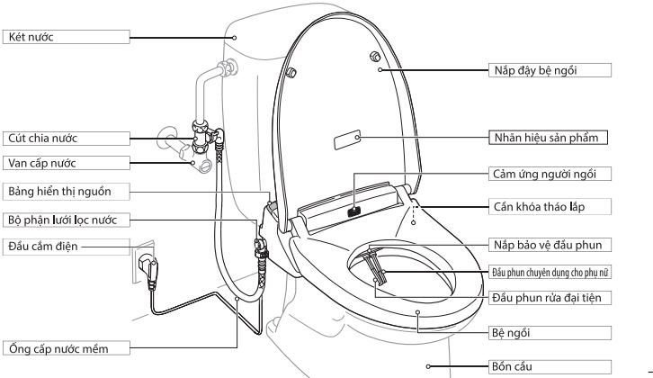 Bảng điều khiển: Thiết kế gắn liền với bệ ngồi hoặc có thể gắn trên tường gần cạnh bồn cầu. Trên bảng điều khiển có những nút bấm rõ ràng giúp người dùng thao tác dễ dàng các chức năng như chế độ sấy khô, chế độ khử mùi, chức năng sưởi ấm,...