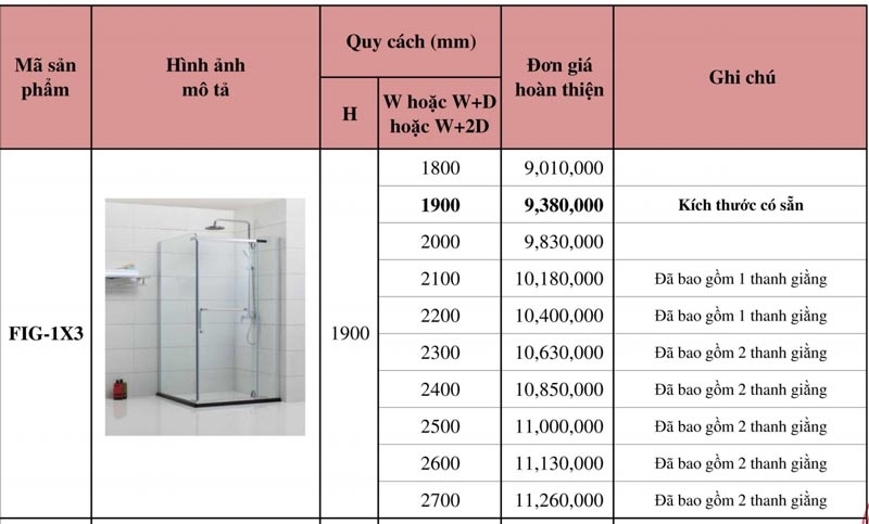 – Giá trên đã bao gồm chi phí hỗ trợ lắp đặt 400.000đ/01 phòng tắm kính.